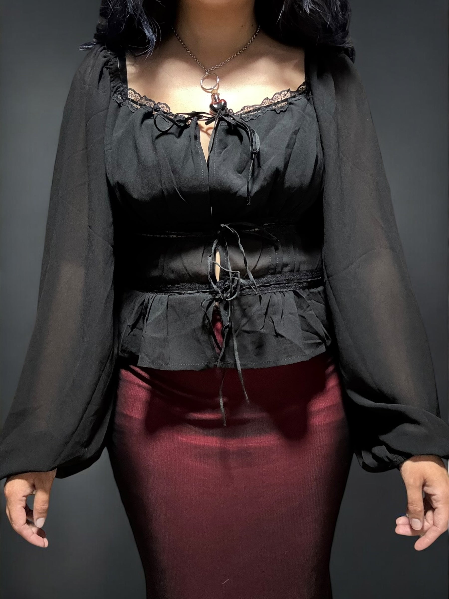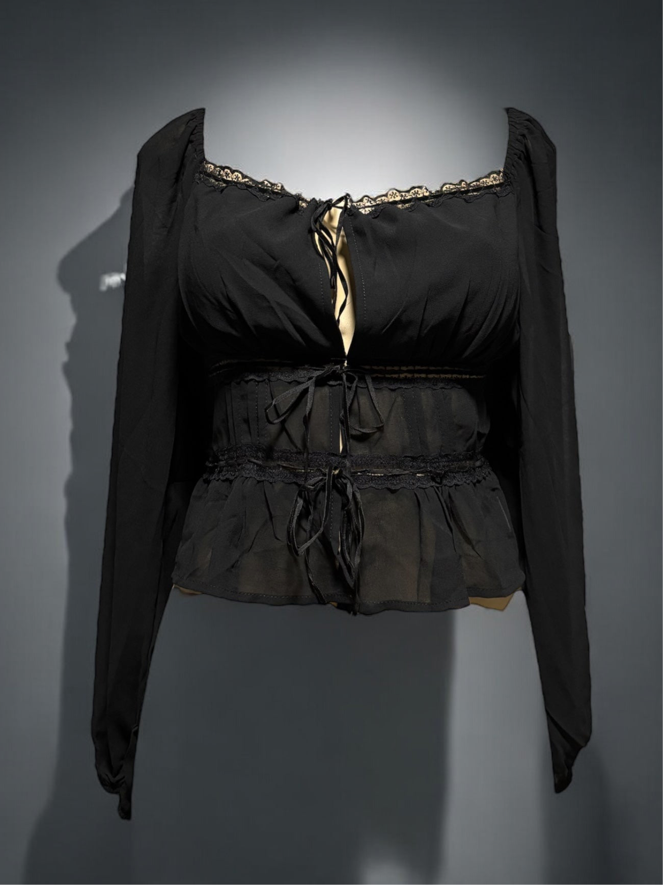 The Selene Top is Mesh with tie up detailing. It does not open up completely. True to size.